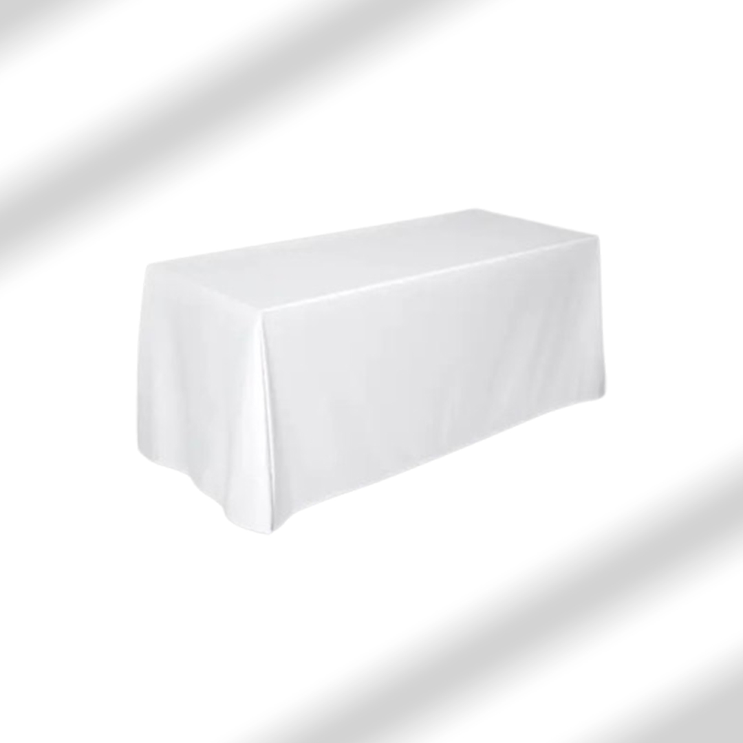 Our rectangular white table cover offers a sleek, elegant touch for buffet setups, food displays, and formal dining. Designed to fit standard tables with full-length drop.